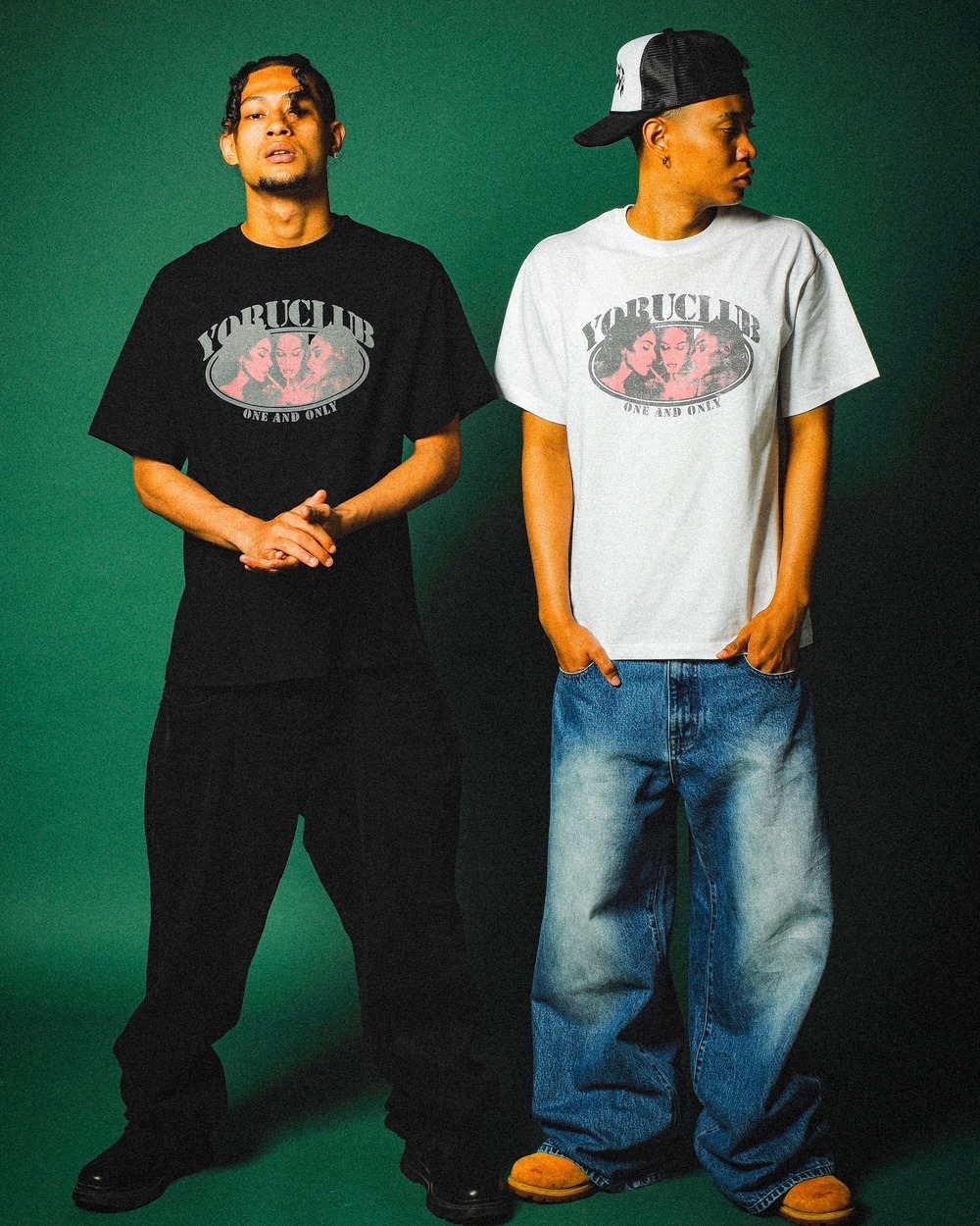 タバコの火を分けあう3人の女性が目を引く、ヴィンテージ加工のフォトプリント。クラシックな雰囲気の中に、YORUらしい毒気と色気を落とし込んだ一枚。フロントには「YORUCLUB」、下部には「ONE AND ONLY」のメッセージを配置。カルチャーと美学が混ざり合う、存在感のあるグラフィックだ。