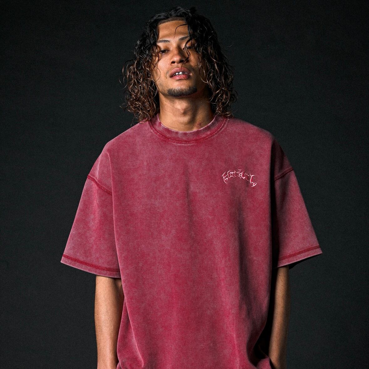 ① 古着加工が施されたTシャツは、程よい肉厚感が魅力で、リラックスした雰囲気を演出します。カジュアルシーンにもピッタリな一品です。