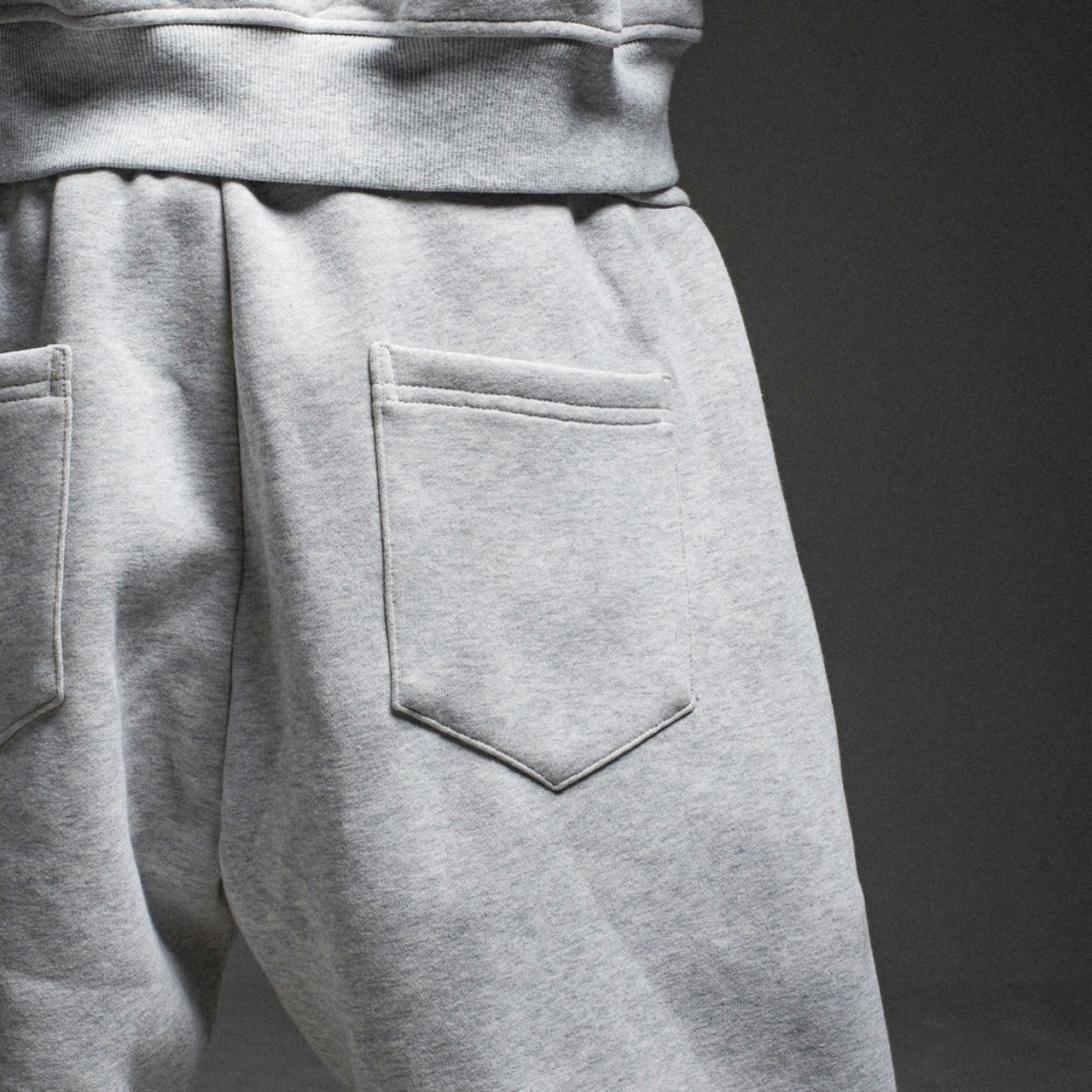 ①太めのウエストコードと立体的な切り替えラインが特徴のスウェットパンツ。