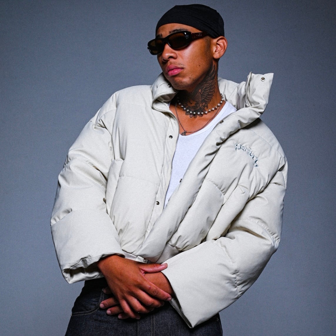 首元の立ち上がりはデザイン性と防寒性を両立しストリートでもラグジュアリーでも通用する存在感を放つ。シンプルなパンツと合わせるだけで完成する、YORUが提案する冬のリアルストリートウェア。