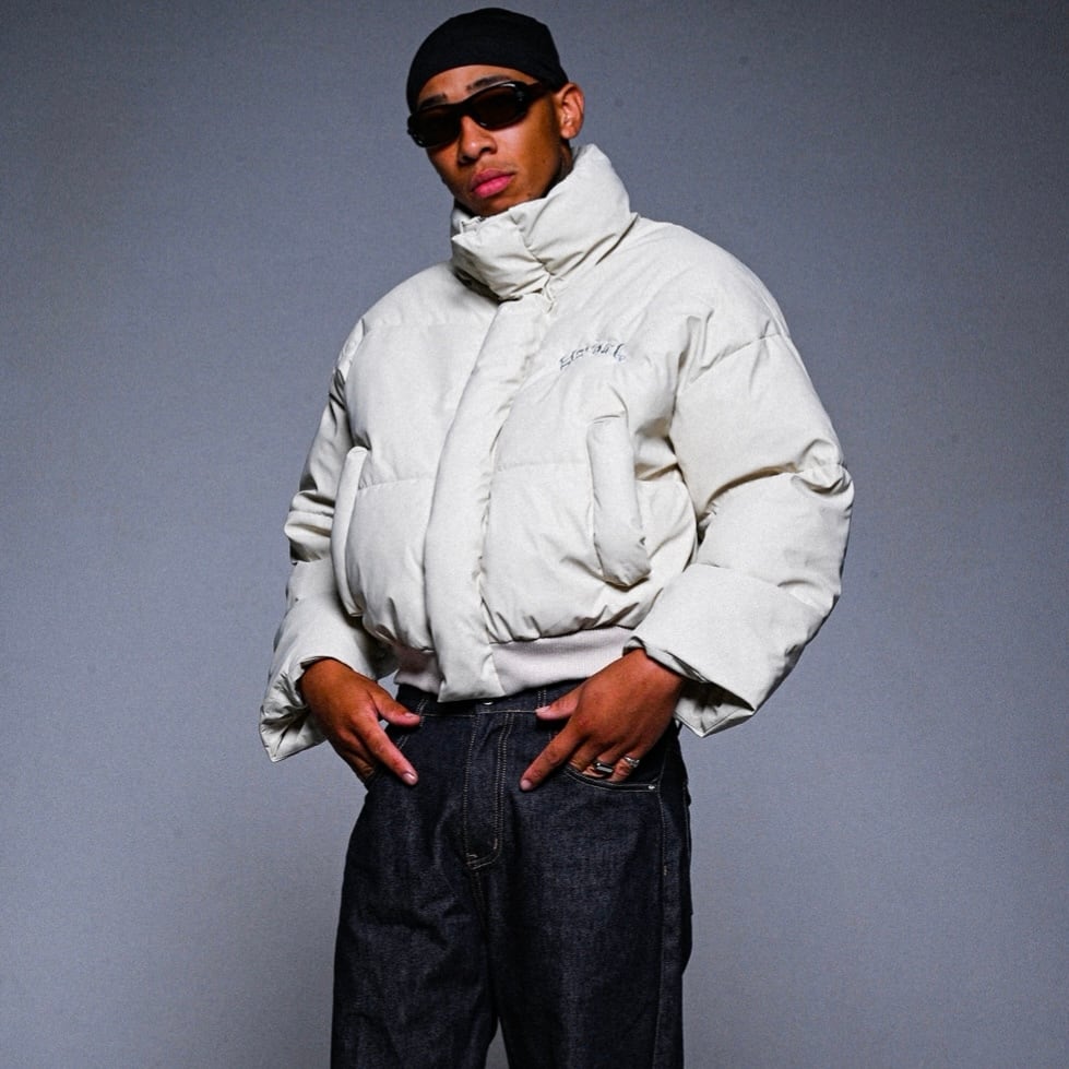 ① 胸元にYORUロゴの刺繍を施した、ショートレングスパファージャケット。膨らみを持たせたフォルムの中にミニマルで都会的な強さを閉じ込めた一着。