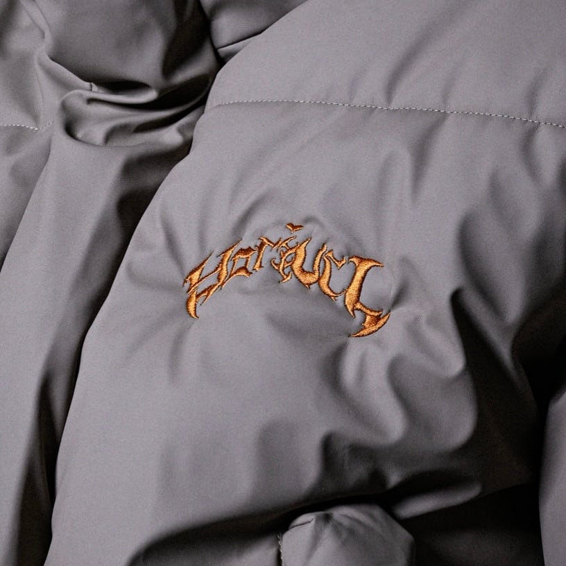 ① 胸元にYORUロゴの刺繍を施した、ショートレングスパファージャケット。膨らみを持たせたフォルムの中にミニマルで都会的な強さを閉じ込めた一着。