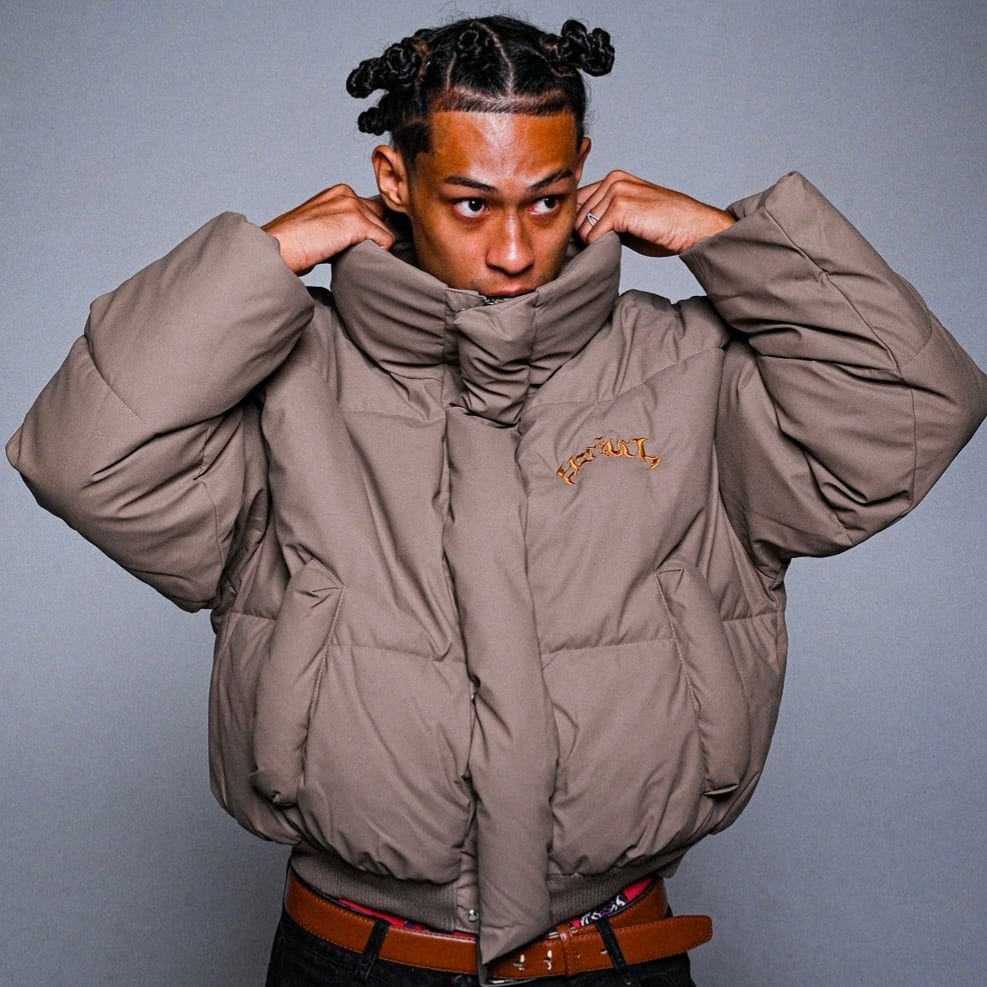 首元の立ち上がりはデザイン性と防寒性を両立しストリートでもラグジュアリーでも通用する存在感を放つ。シンプルなパンツと合わせるだけで完成する、YORUが提案する冬のリアルストリートウェア。
