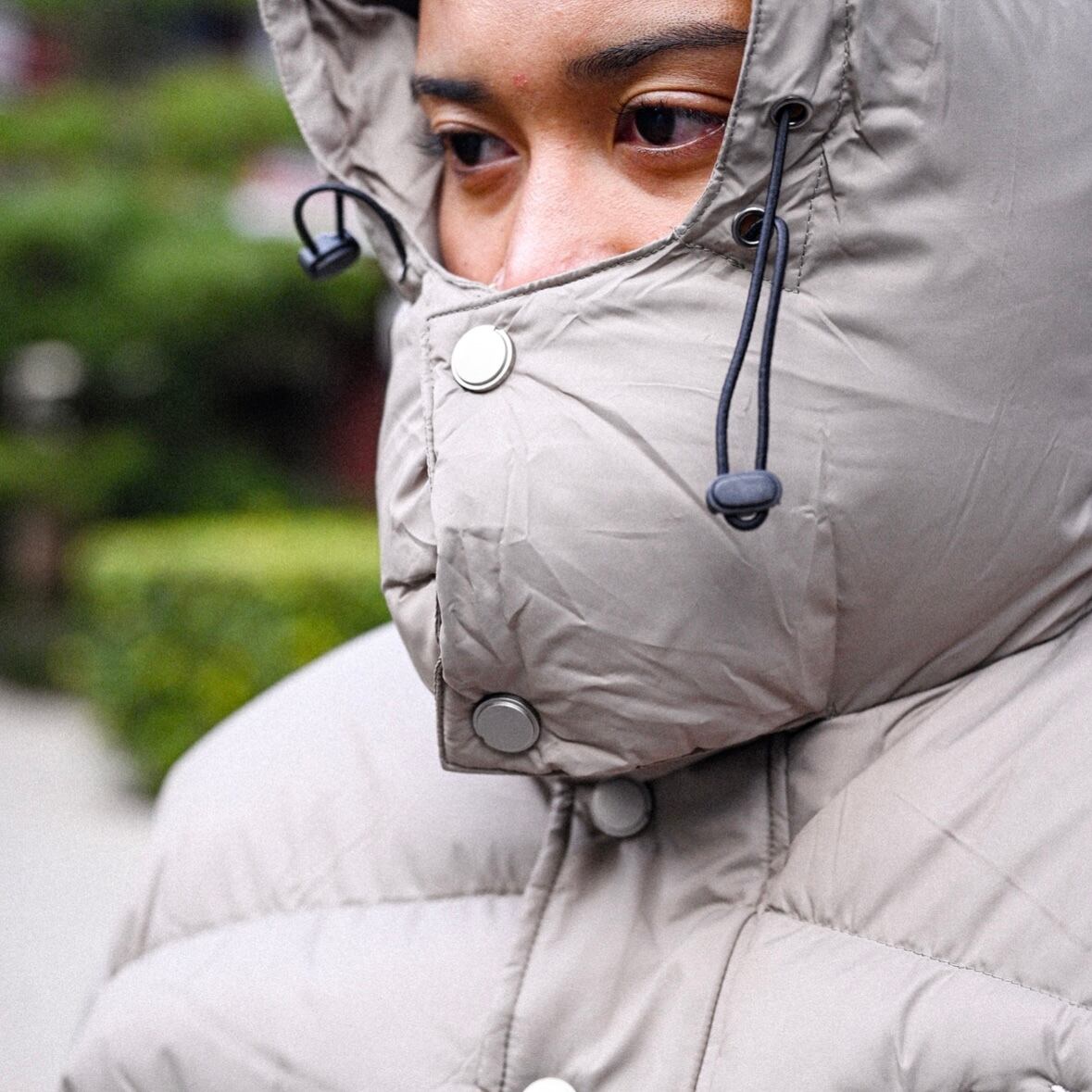 フードを締めれば、視線だけを残した目出しスタイルになり、街でも自然に成立する強さを演出する。