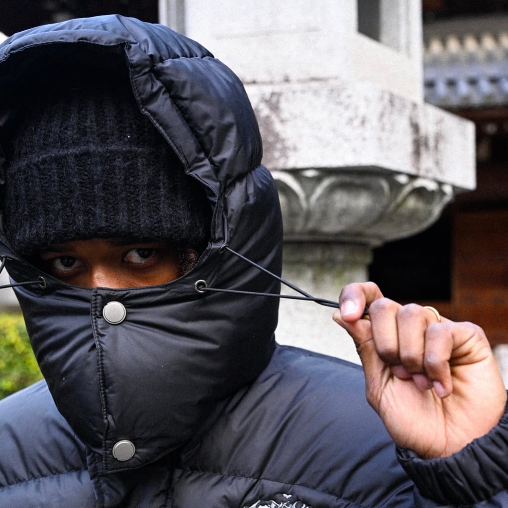 フードを締めれば、視線だけを残した目出しスタイルになり、街でも自然に成立する強さを演出する。