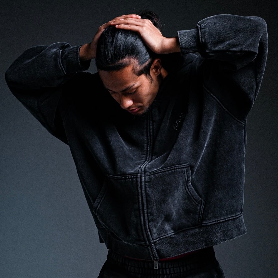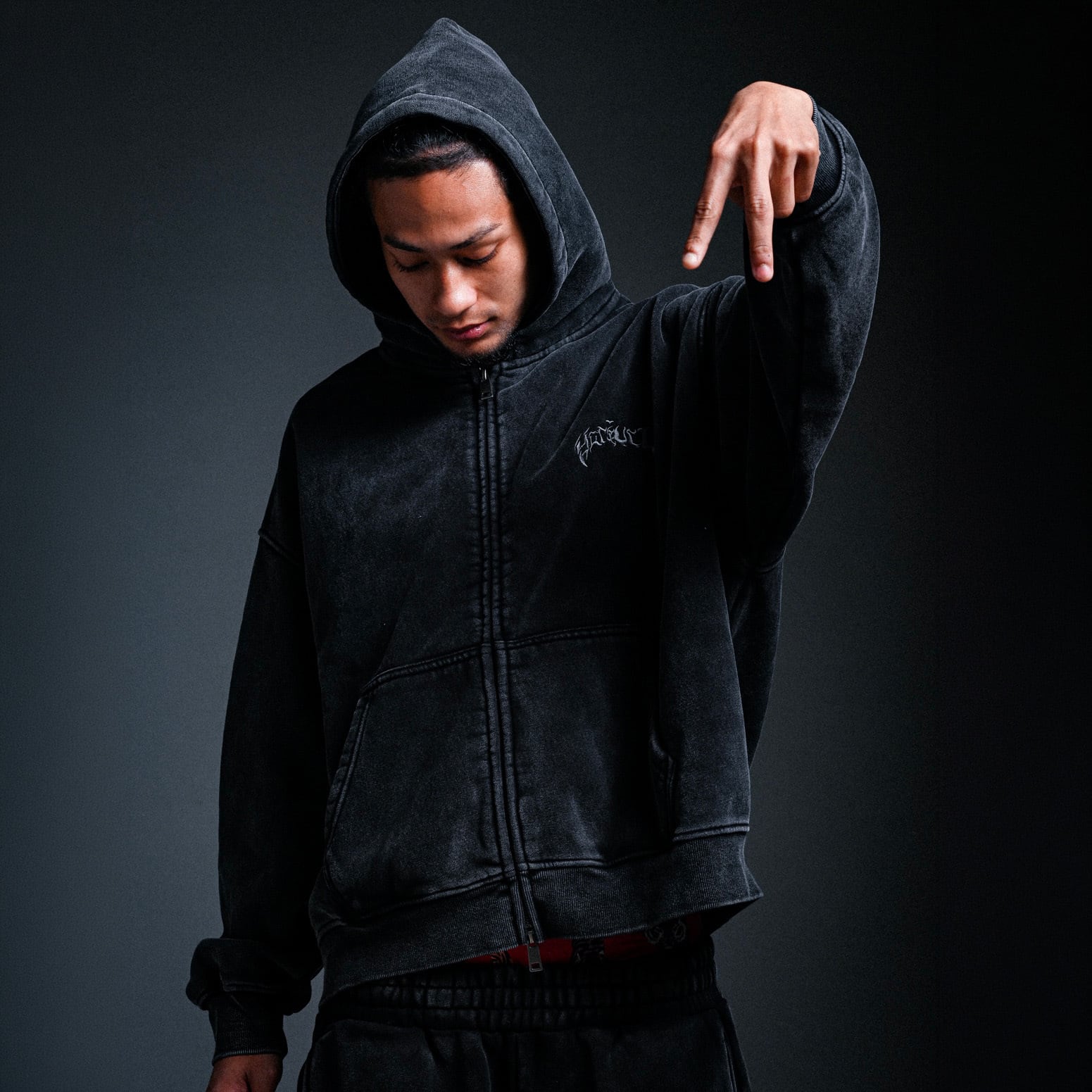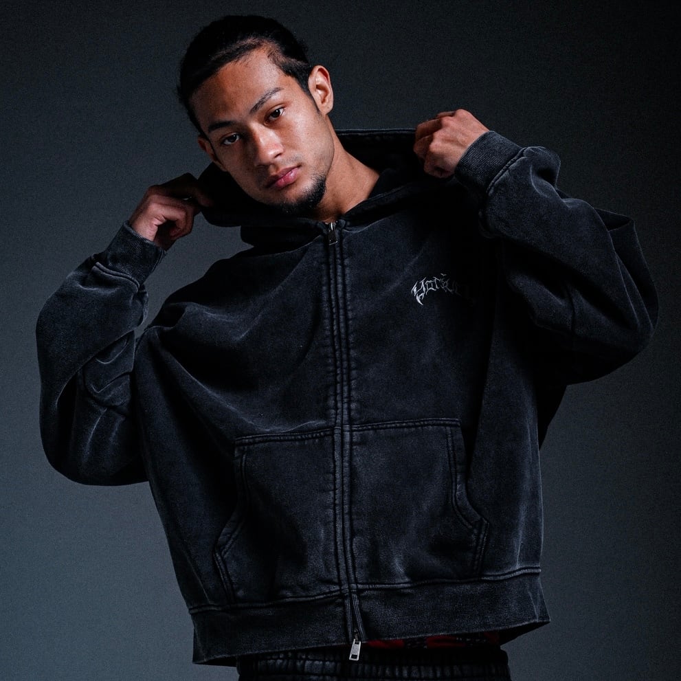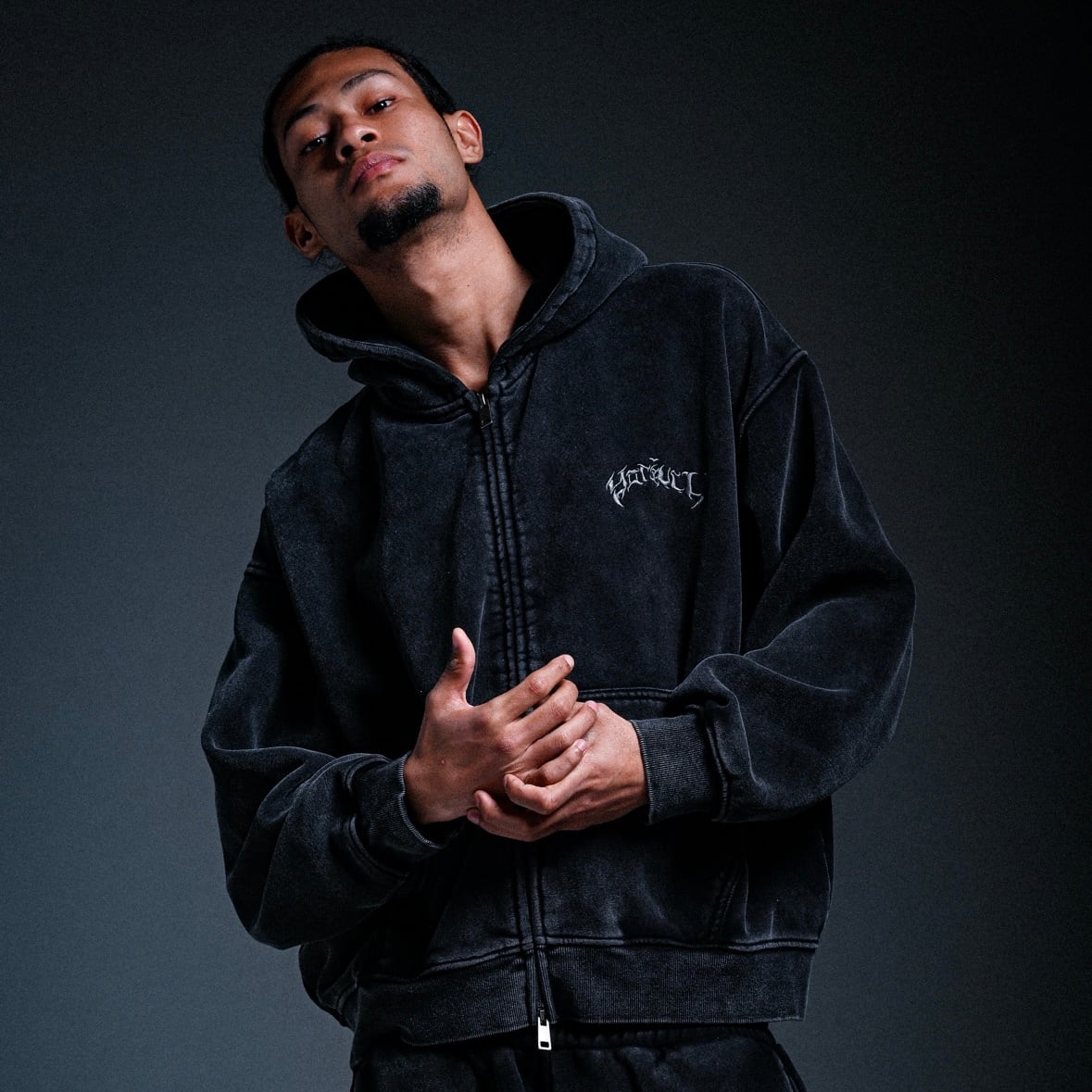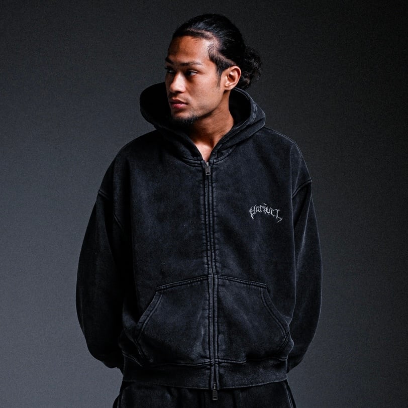① 古着加工が施されたジップフーディーは、程よい肉厚感が魅力で、リラックスした雰囲気を演出します。カジュアルシーンにもピッタリな一品です。