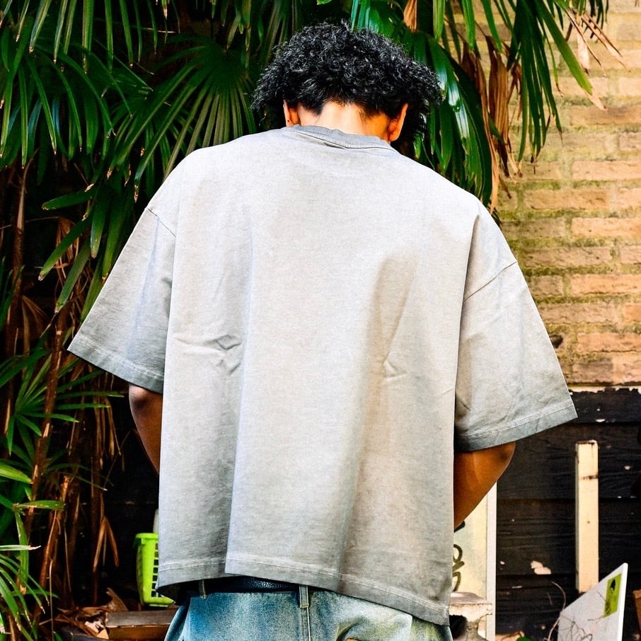 ① 蝋染め(バチック)加工を施したヘビーウェイトTシャツは、275gの肉厚な生地感が魅力で、着るほどに味が出るヴィンテージライクな雰囲気を演出します。ストリートシーンにもデイリーユースにもフィットする一枚です。