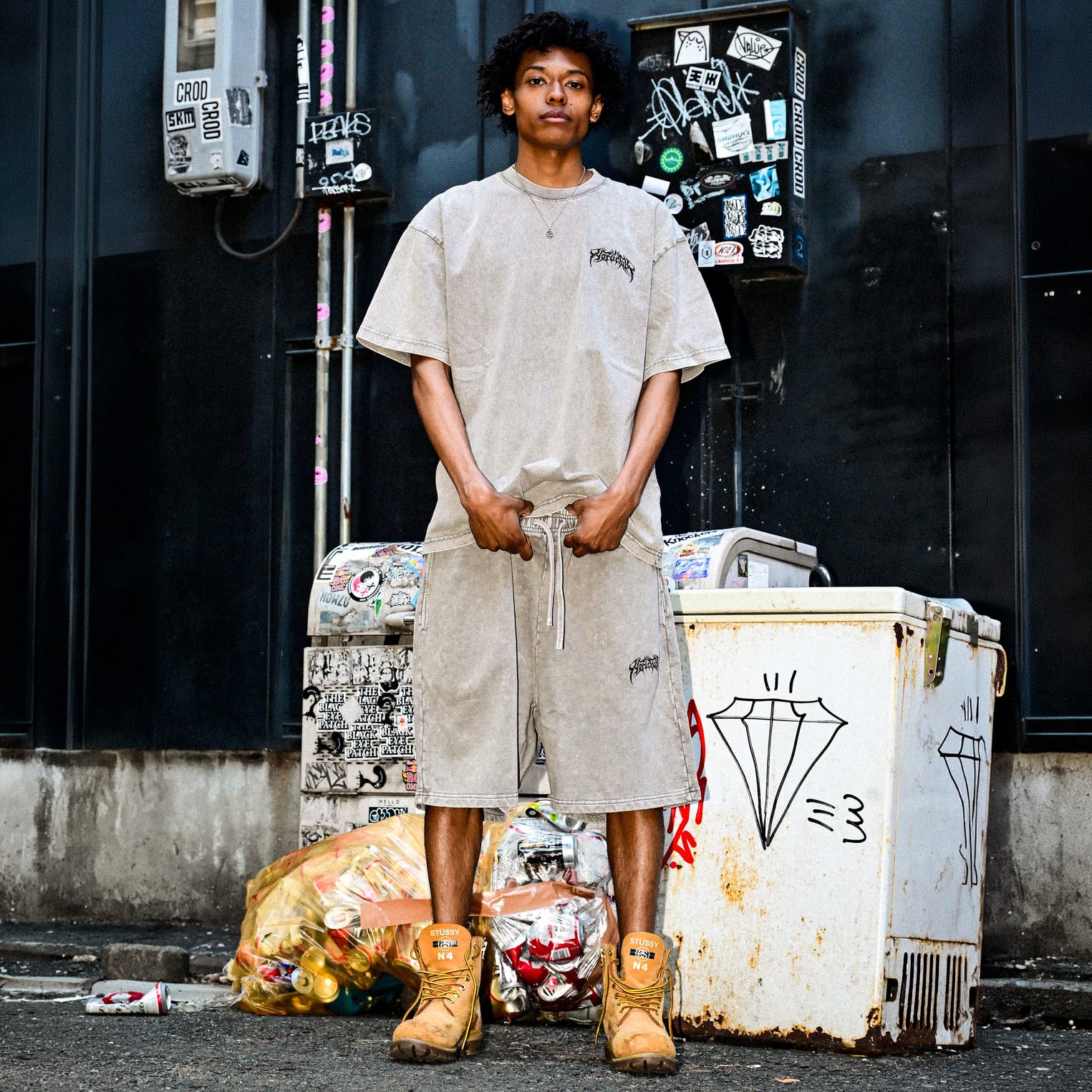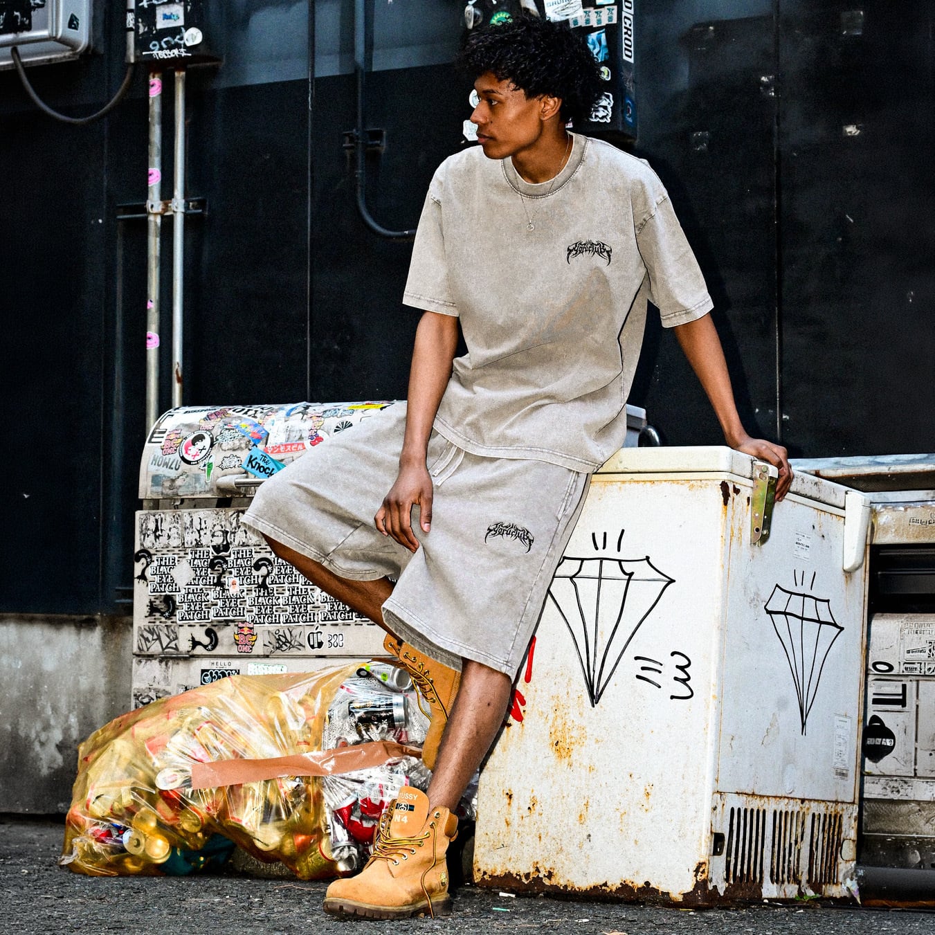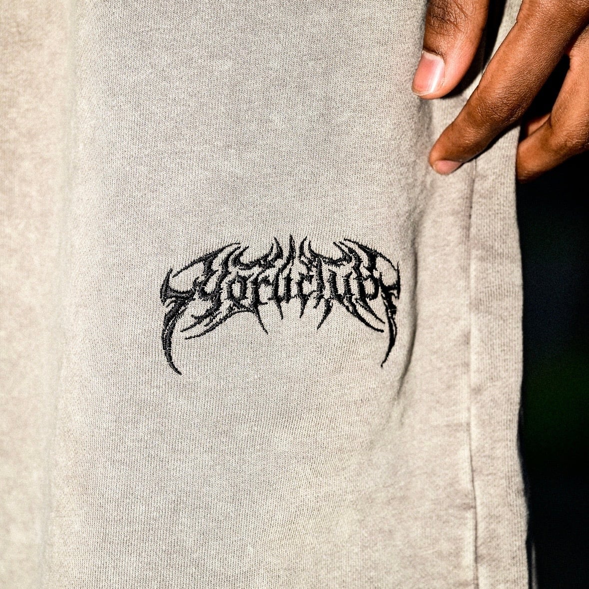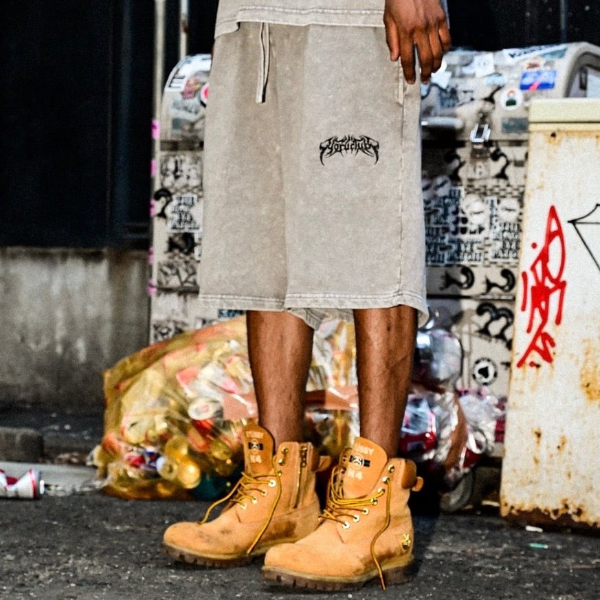 ③ YORUのOGメタルロゴが左腿にさりげなく入ったデザインは、穿くだけで独自の世界観を表現。セットアップのTシャツとはもちろん、ヘビーウェイトTやロンTとも相性抜群で、コーデに深みをプラスしてくれます。