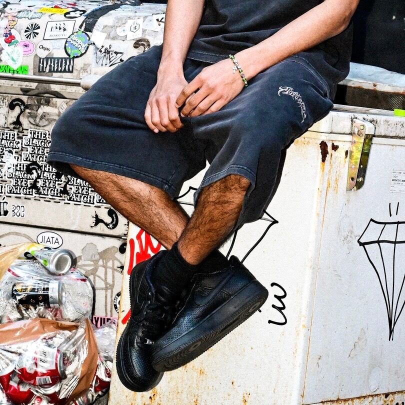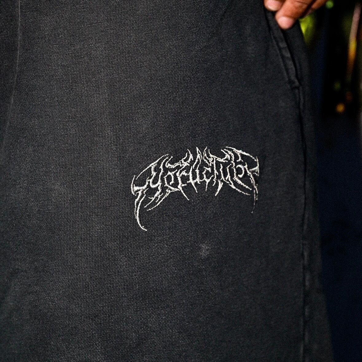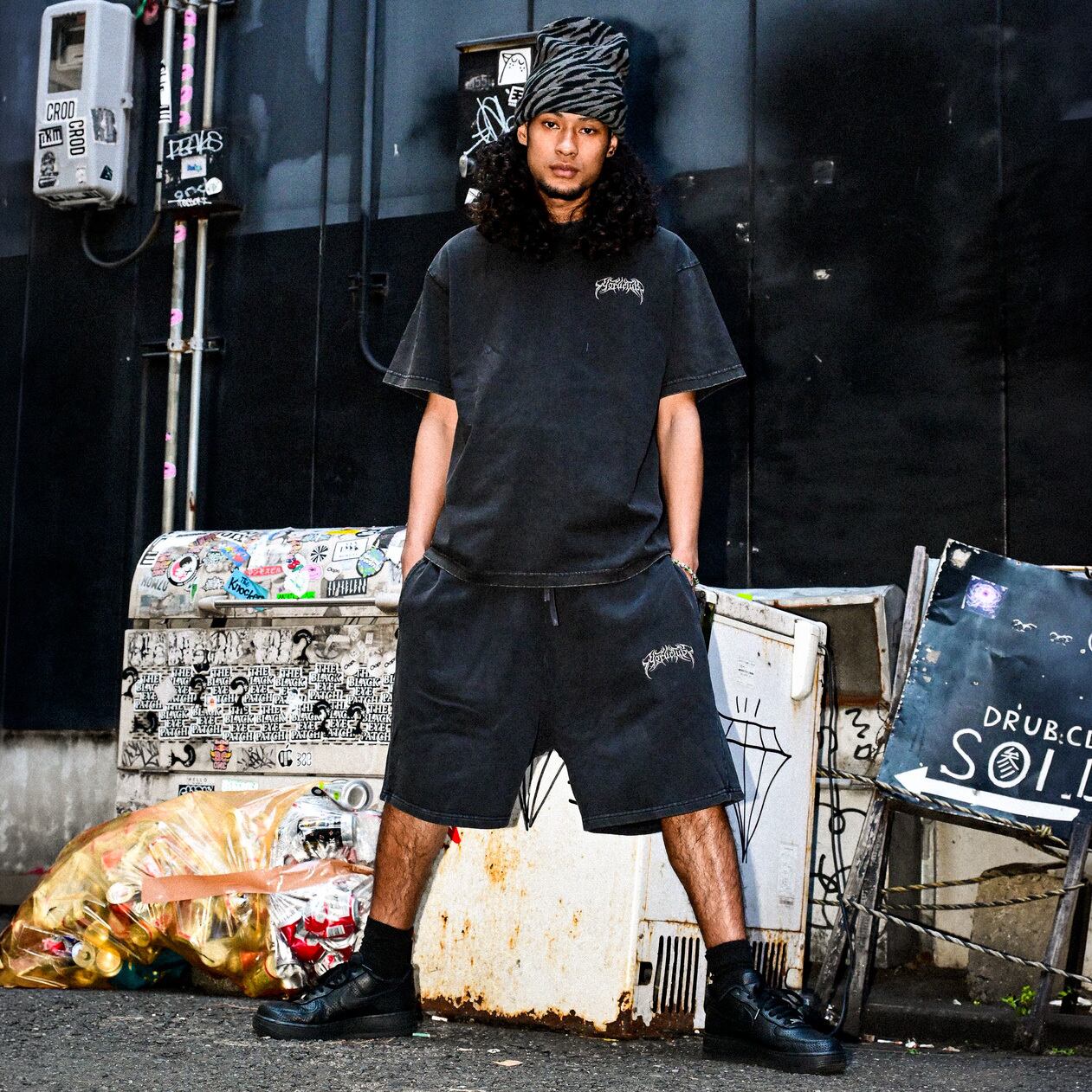 ③ YORUのOGメタルロゴが左腿にさりげなく入ったデザインは、穿くだけで独自の世界観を表現。セットアップのTシャツとはもちろん、ヘビーウェイトTやロンTとも相性抜群で、コーデに深みをプラスしてくれます。