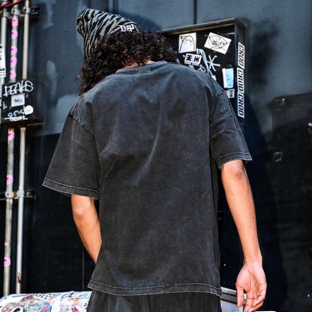 ① 蝋染め(バチック)加工を施したヘビーウェイトTシャツは、8.1オンスの肉厚な生地感が魅力で、着るほどに味が出るヴィンテージライクな雰囲気を演出します。ストリートシーンにもデイリーユースにもフィットする一枚です。