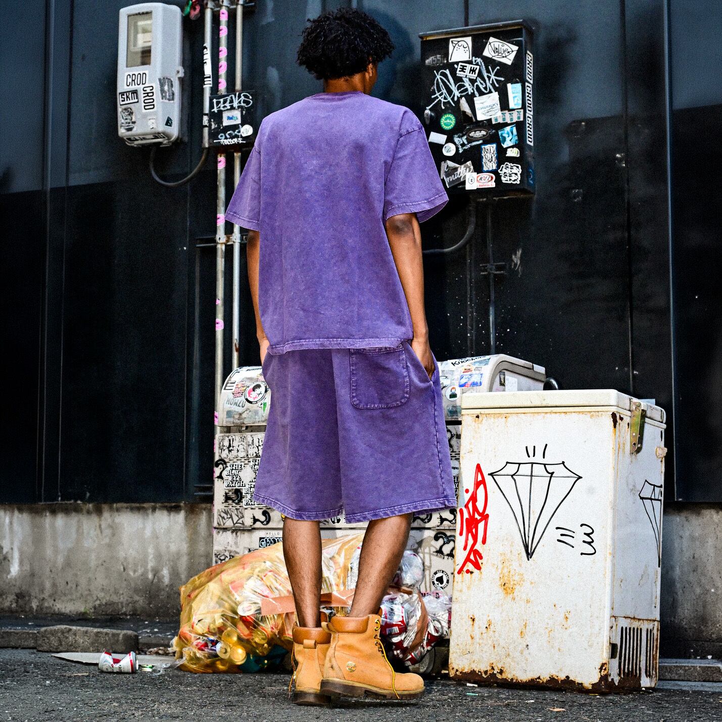 ③ YORUのOGメタルロゴが左腿にさりげなく入ったデザインは、穿くだけで独自の世界観を表現。セットアップのTシャツとはもちろん、ヘビーウェイトTやロンTとも相性抜群で、コーデに深みをプラスしてくれます。