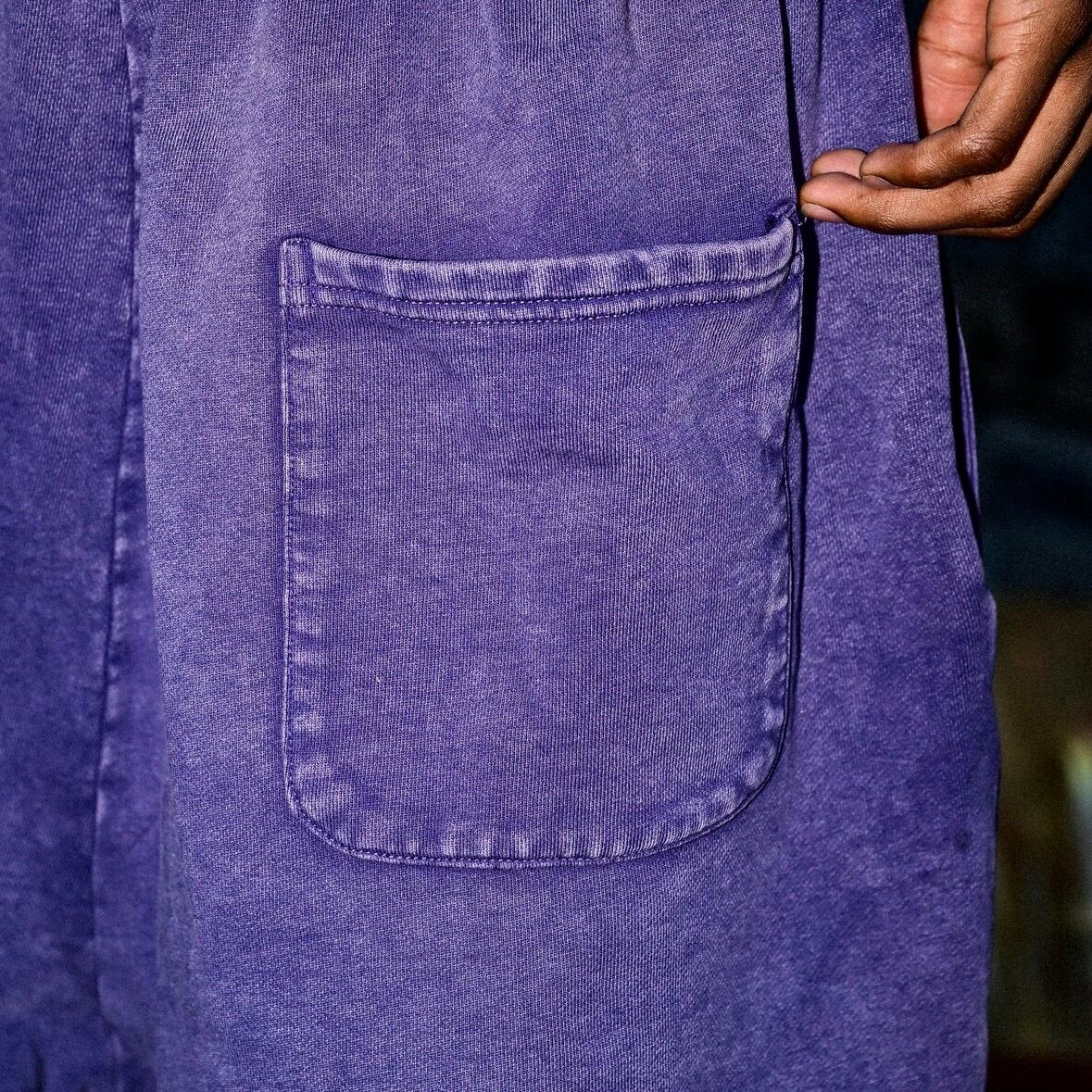 ① ピグメント加工を施したヘビーウェイトショーツは、9.4オンスの肉厚な生地感が魅力で、穿くほどに味が出るヴィンテージライクな雰囲気を演出します。ストリートシーンにもデイリーユースにもフィットする一本です。