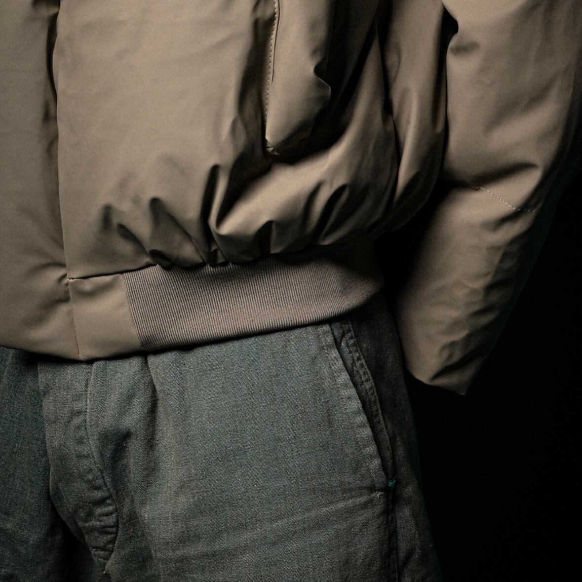 ① 艶感のある高品質なプファージャケットが、シンプルながらもスタイリッシュな存在感を与えます。どんなコーディネートにもエレガントさをプラスしてくれる一品です。